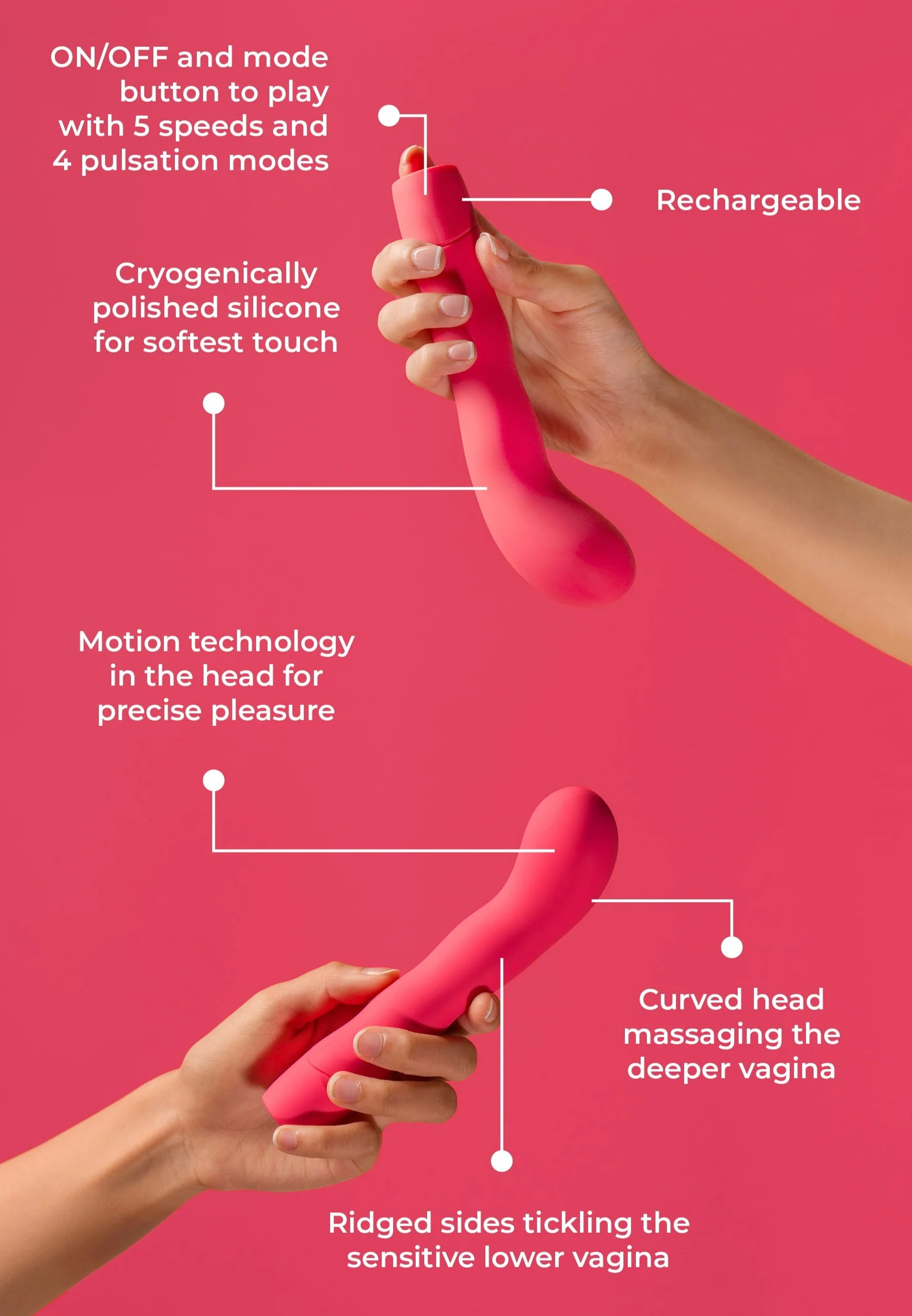 Powerful motion technology in the head sends out targeted pulsations from the G spot to the cervix area. But relax – it’s whisper-quiet.
